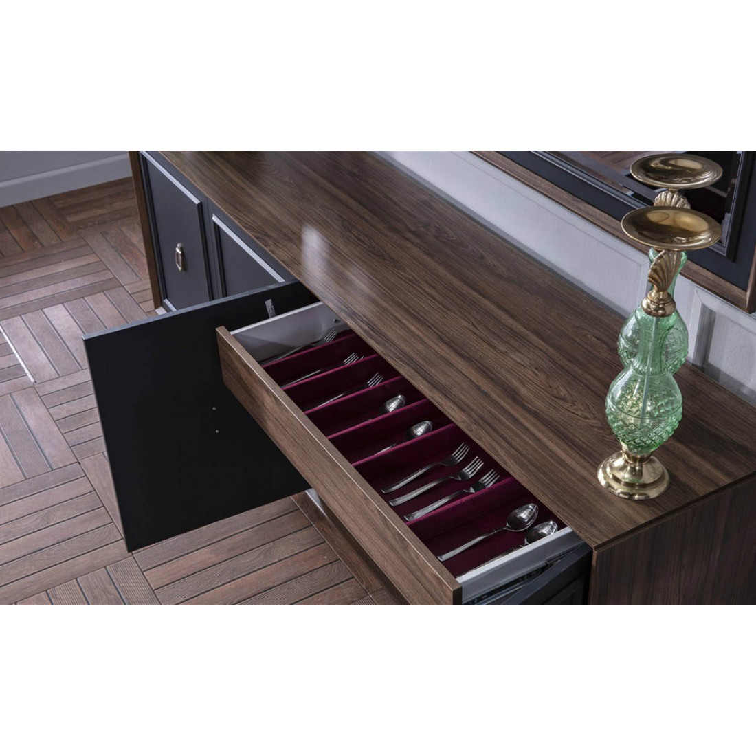 Длинный комод для посуды в гостиную ALEG-10 серии Алегро от Беллона средней высоты (840) станет прекрасным, многофункциональным дополнением интерьера гостиной и столовой. Ажурные ручки образуют единый декоративный элемент, сходясь в центре фасадов. В качестве материала для фасадов, столешницы и ножек использовался МДФ.