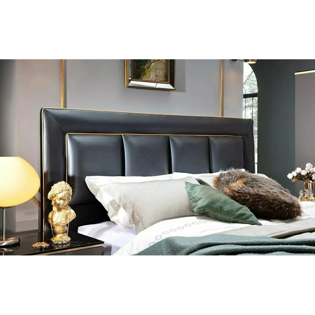 Спинка кровати CARLINO щитовой конструкции, полуфабрикат щита плита ДСП т.16-18мм, панели панно плита ДСП т.10мм. Настил панно поролон т.50мм, настил панели спинки проролон т.20мм.Чехол спинки, винилискожа. Чехол декорирован кантом в винилискожи золотистого цвета, шнур пластм.ф.6мм.