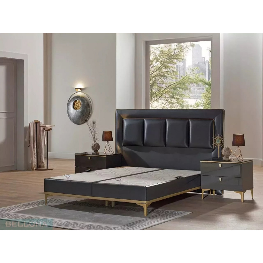 Кровать (база) без спинки CARLINO, щитовой конструкции на декоративных ножках c подъемным жестким основанием под матрас. Щитовой каркас кровати плита ЛДСП т.18мм, дно плита МДФ 6мм. Каркас обит поролоном, винилискожей двух цветов, основного цвета и в нижней части обивка винилискожа контрастного золотого цвета.  Жесткое основание кровати рамочной металлической конструкции на основе трубы профильной размером 20х30,20х20 с подъемным механизмом. Настил основания поролон т.3мм, основание обито тканью. Сборка каркаса базы на шкант, скобу металлическую, уголок пластмассовый. Подъемный механизм устанавливается при помощи винтов и винтов с гайками. Ножки кровати пластмассовые, четыре ножки декоративные, шесть опорных круглых ножек, ввинчивающихся для двойных баз. На дно базы устанавливается аэратор пластмассовый с логотипом Bellona для    кондиционирования воздуха. Ручка -держатель для подъемного основания металлическая.