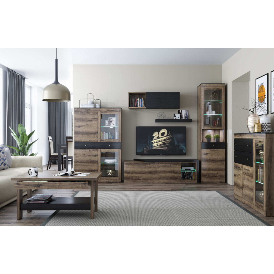 Отличительная черта гостиной Джаггер - сочетание контрастов. Это современная мебель, которая хорошо смотрится как в современном, так и в классическом интерьере. Эта многомерность и универсальность были достигнуты благодаря умелому сочетанию дуба монастырского и части фасадов, поддерживаемых в черном цвете.
