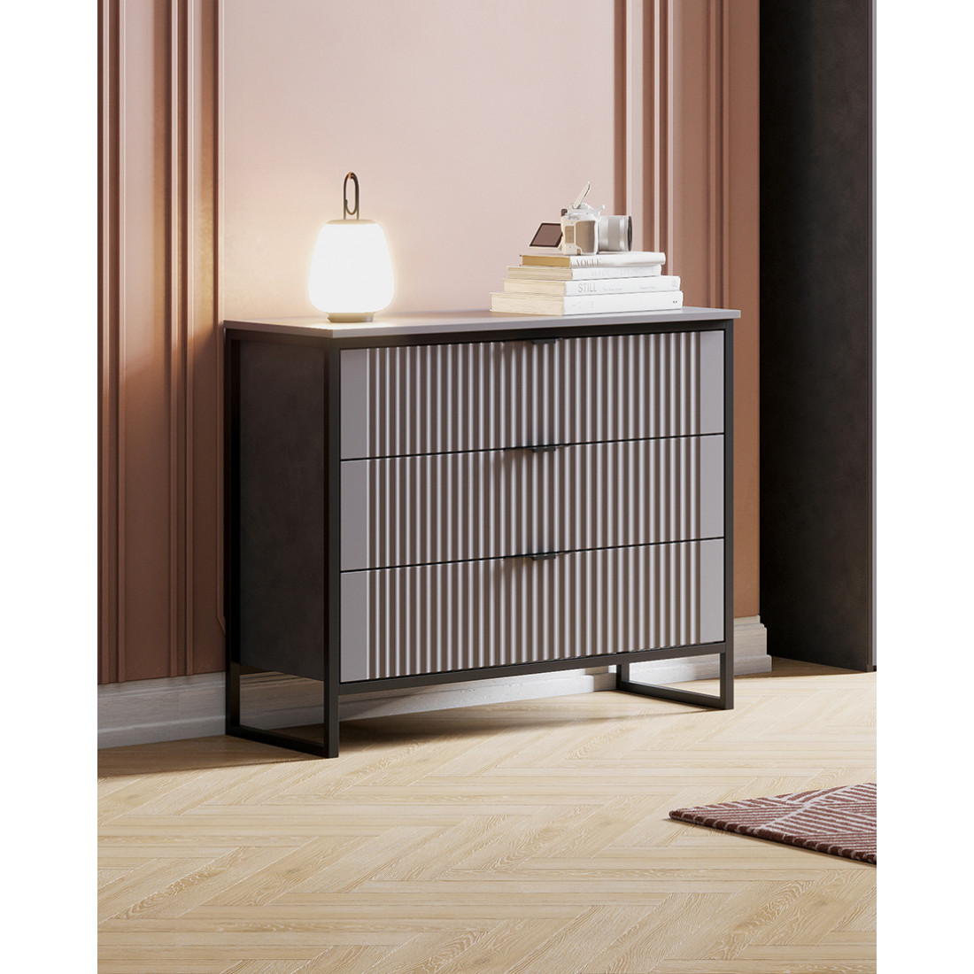 Комод "Нора" на металлокаркасе состоит из трех выдвижных ящиков на шариковых направляющих, что позволяет удобно хранить вещи и поддерживать порядок в комнате. Он выполнен из безопасных, качественных материалов (лдсп и мдф), что гарантирует долговечность и сохранение первоначального вида на протяжении долгого времени.