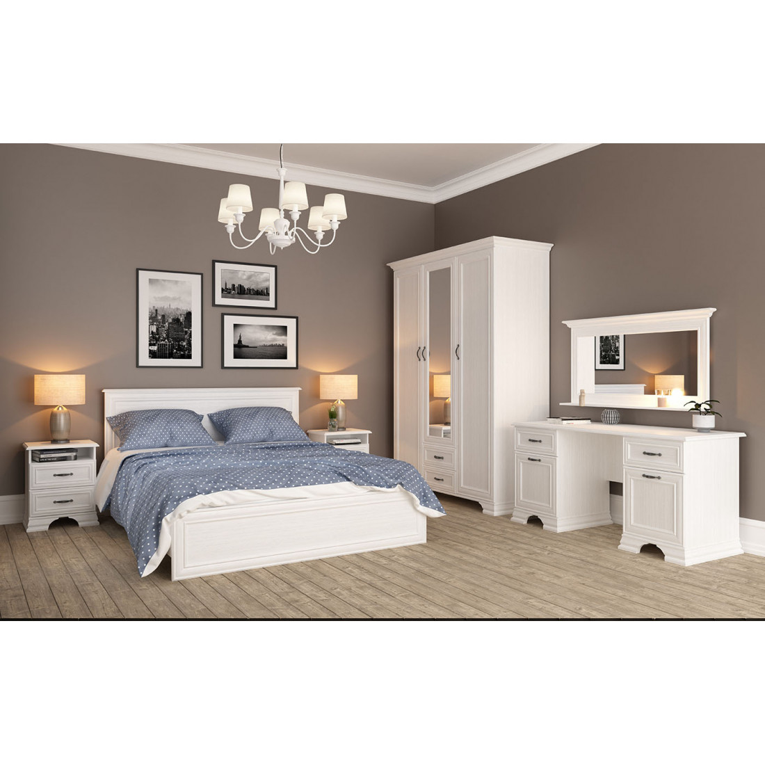 Мебель для спальни Юнона от фабрики Мебель-Неман композиция 2 - спальный гарнитур в классическом стиле с отделкой структурной фактуры, обрамленный рамочным фасадом, где металлические ручки выгодно подчёркивают стиль и изящество, всегда актуален и востребован.