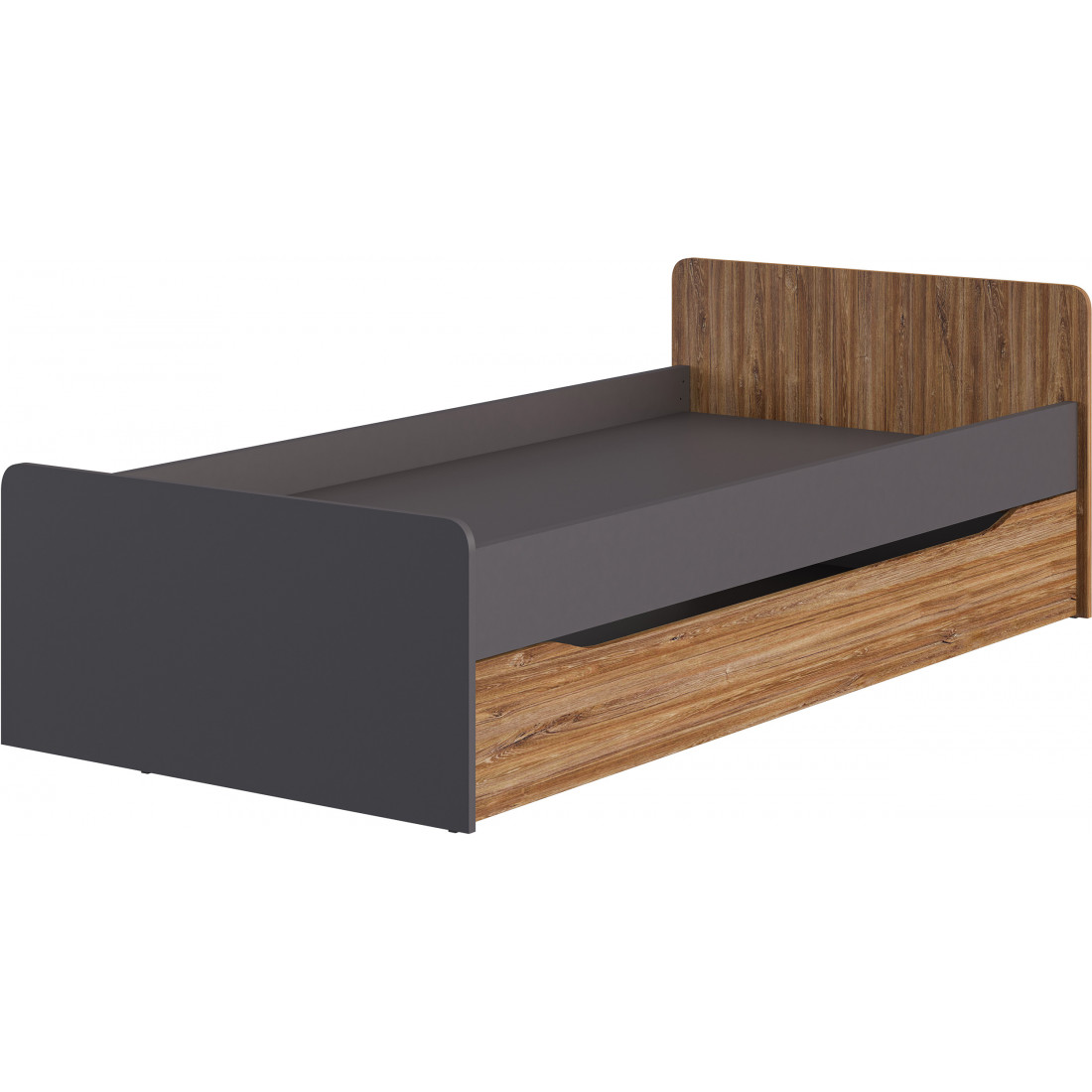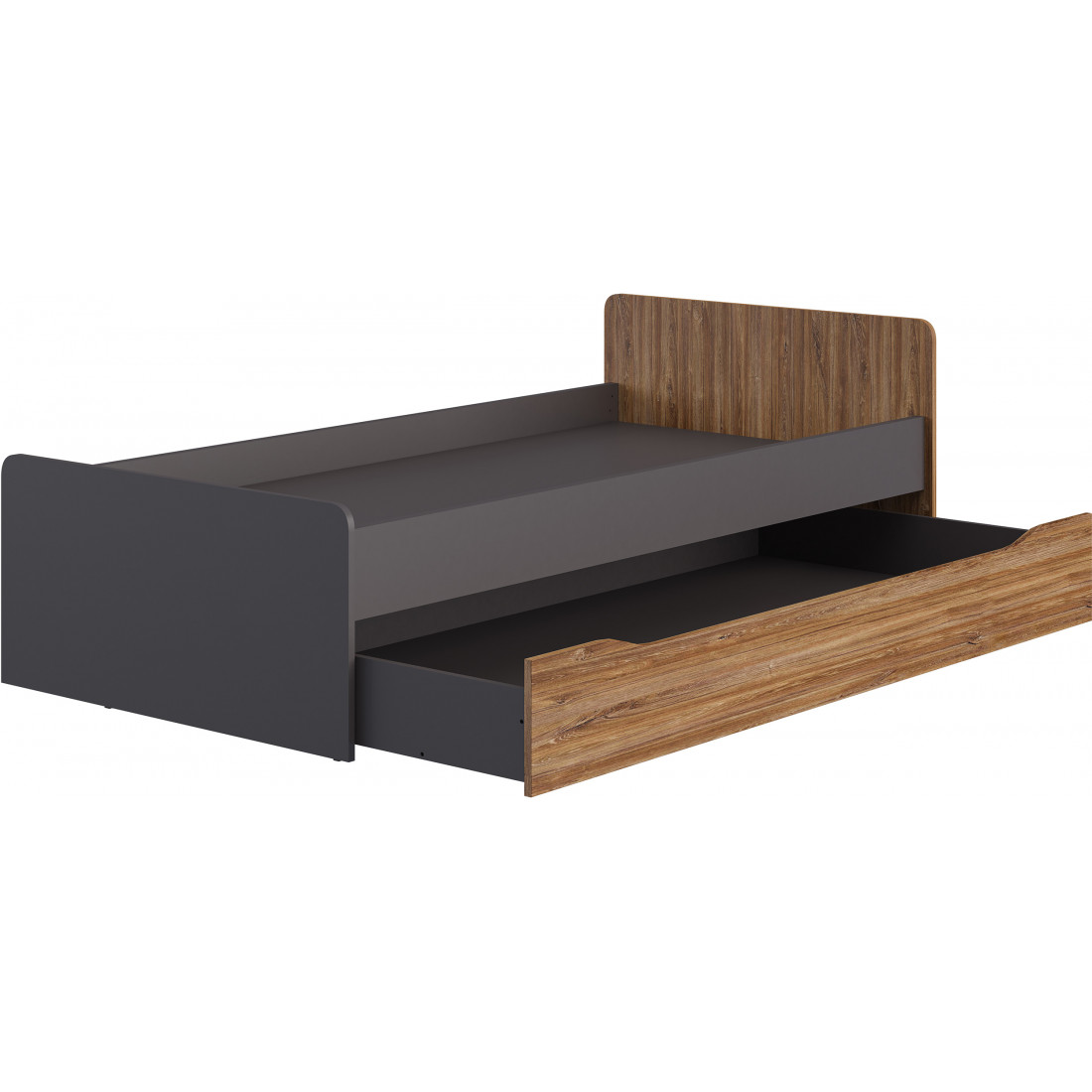 Кровать МН-135-29 с одним большим выкатным ящиком, который можно использовать как дополнительное спальное место либо ящик для хранения. Размер основного спального места 200*90,