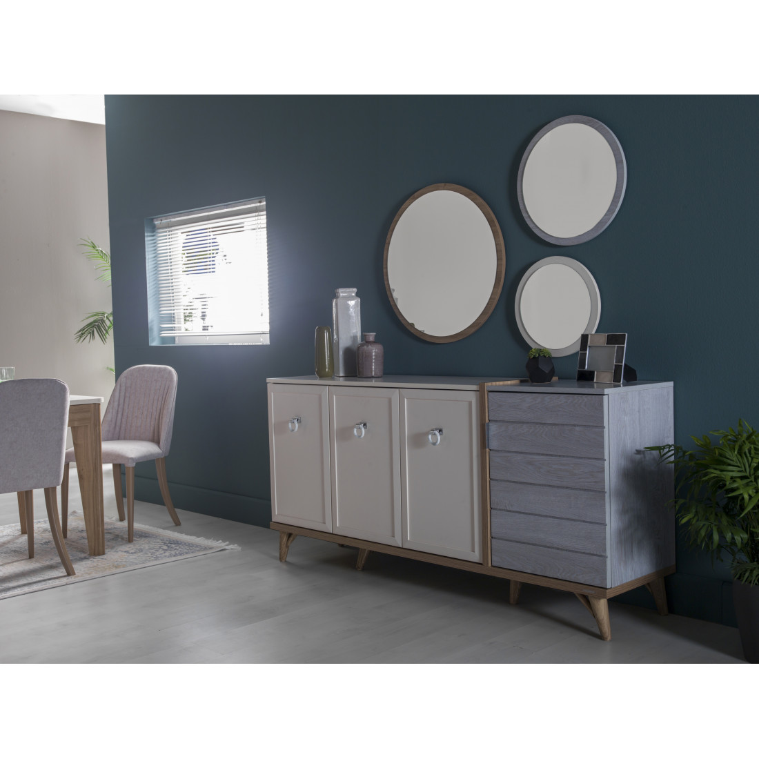 Широкий буфет для посуды Мавенна в современном стиле прованс от турецкой фабрики Bellona придаст дополнительного одобрения за вместительность и функциональность. Снаружи прилавок выполнен в сочетании молочного цвета и серой имитации горизонтальных досок, с декоративной отделкой цвета орех. Внутри в широком отделении выдвижной ящик с разделителями для столовых приборов, в узких отделениях- полка.