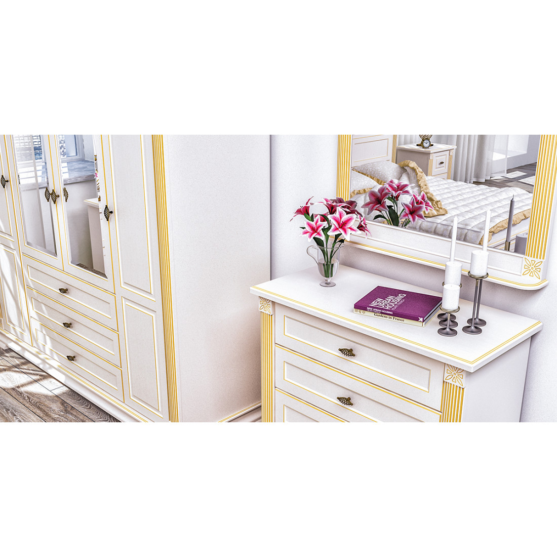 Роскошный трехстворчатый шкаф для одежды и белья МН-222-13 в спальню новой серии Афина (Мебель-Неман) выполнен в светлом кремовом оттенке с золотой патиной, является настоящим подарком производителя. Купить шкаф можно для комплекта полного спального гарнитура Афина с другими элементами серии или отдельно.