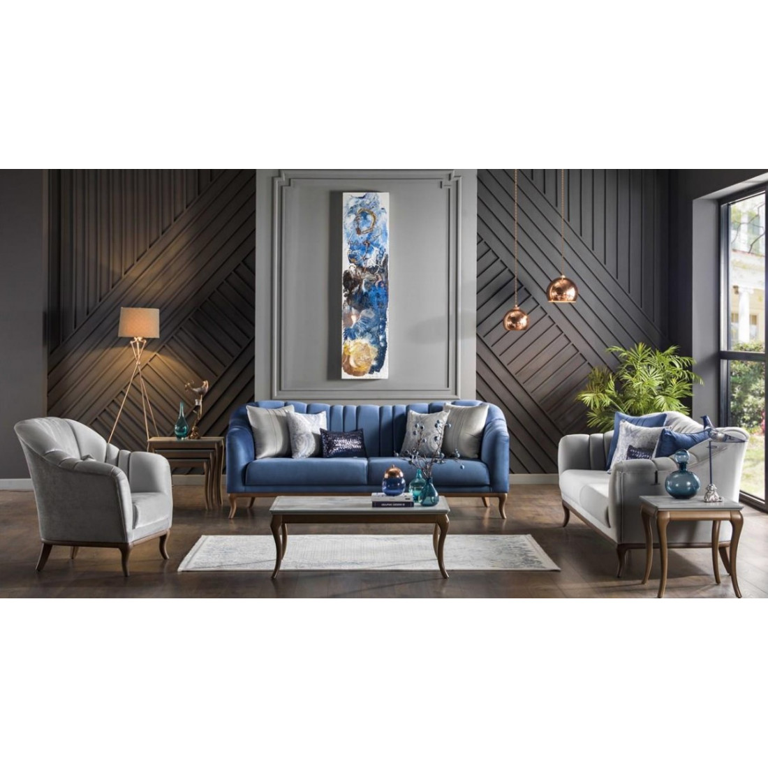 Идеальные вертикальные линии на спинке и подлокотниках выделяют трехместный диван из коллекции "Pesaro" среди конкурентов. Он представлен в нескольких цветовых вариантах: в синих, белых и фиолетовых тонах. В комплект входят пять разнообразных подушек, четыре из которых квадратные и одна маленькая прямоугольная. Высокие ножки, обрамлённые прекрасным декором с древесной текстурой, упростят уборку в доме. Ткань этого дивана невероятно мягкая и очень легко чистится