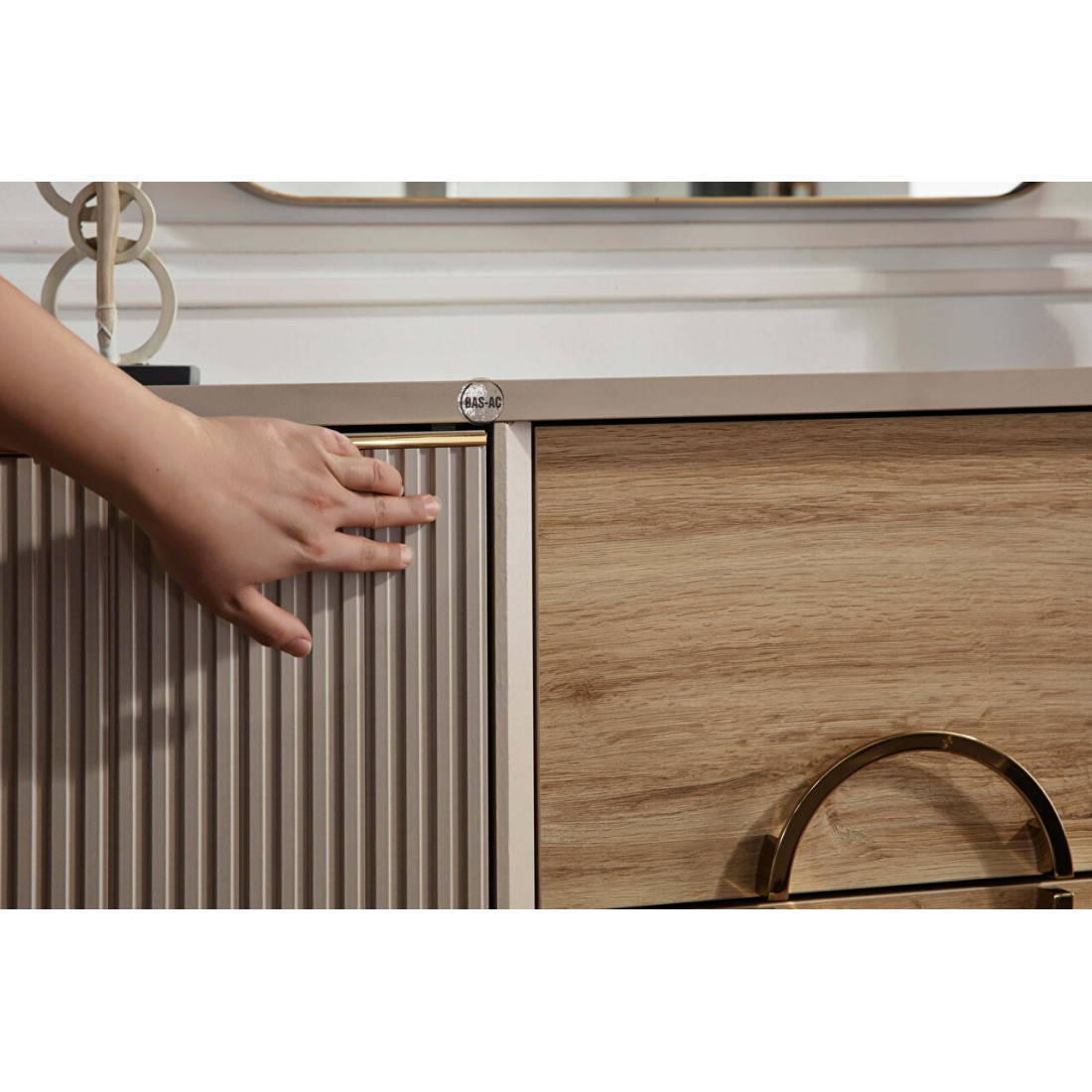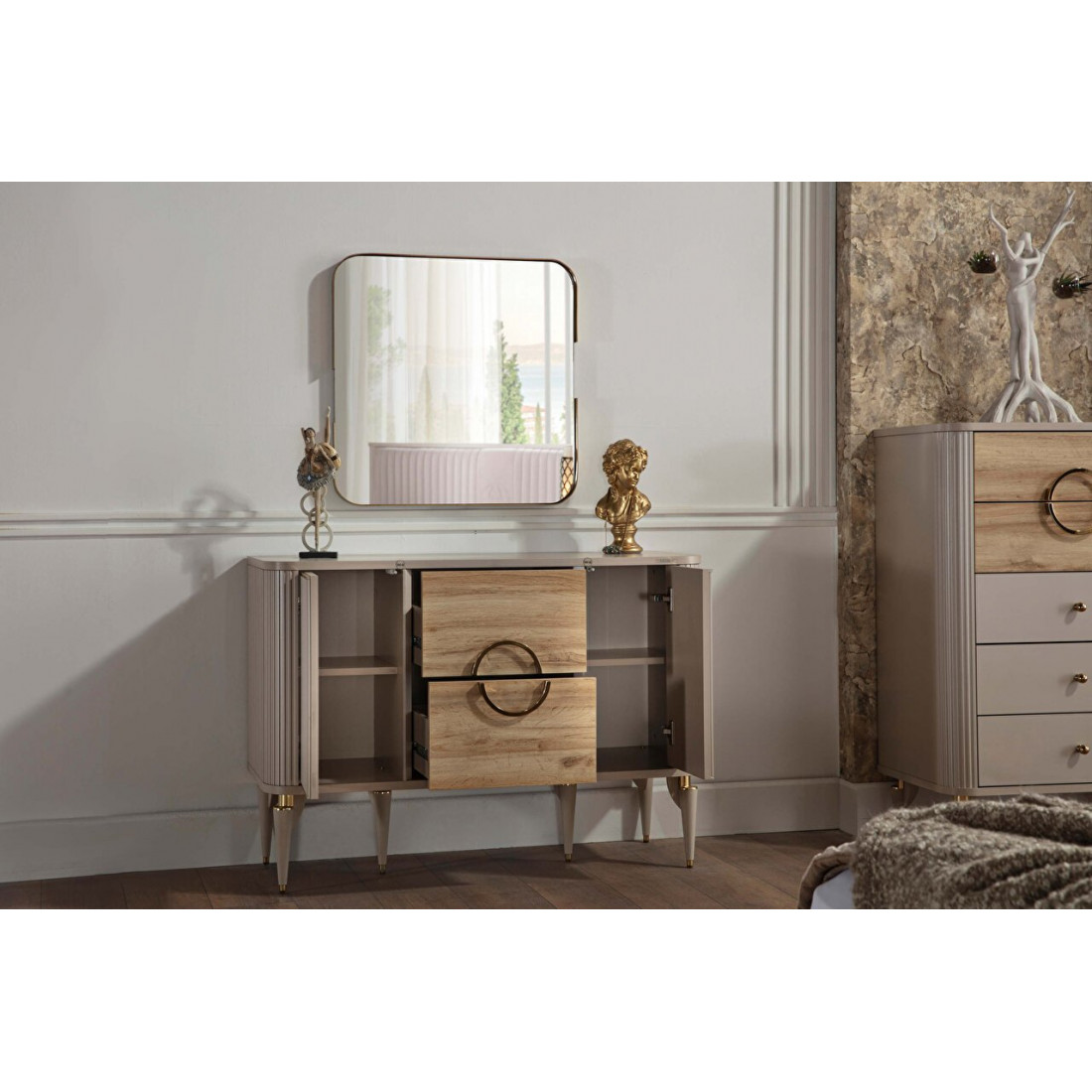 Туалетный столик Санвито SANV-23 один из элементов турецкой коллекции SANVITO. Прекрасное дополнение интерьера спальни, гостиной, залы. Столик обладает сравнительно небольшими размерами 1,170 мм x 470 мм x 830 мм. Может использоваться как дамский столик или как комод. Имеет два больших вместительных выдвижных ящика по центру, и полки для хранения за дверцами фасадов. Кремовый оттенок фасадов, наряду с рифленой  поверхностью комбинируется с древесной фактурой ящичков. Оригинальный дизайн и теплые, нежные тона в сочетании с функциональностью столика-комода Санвито SANV-23 делают его изящным и привлекательным.