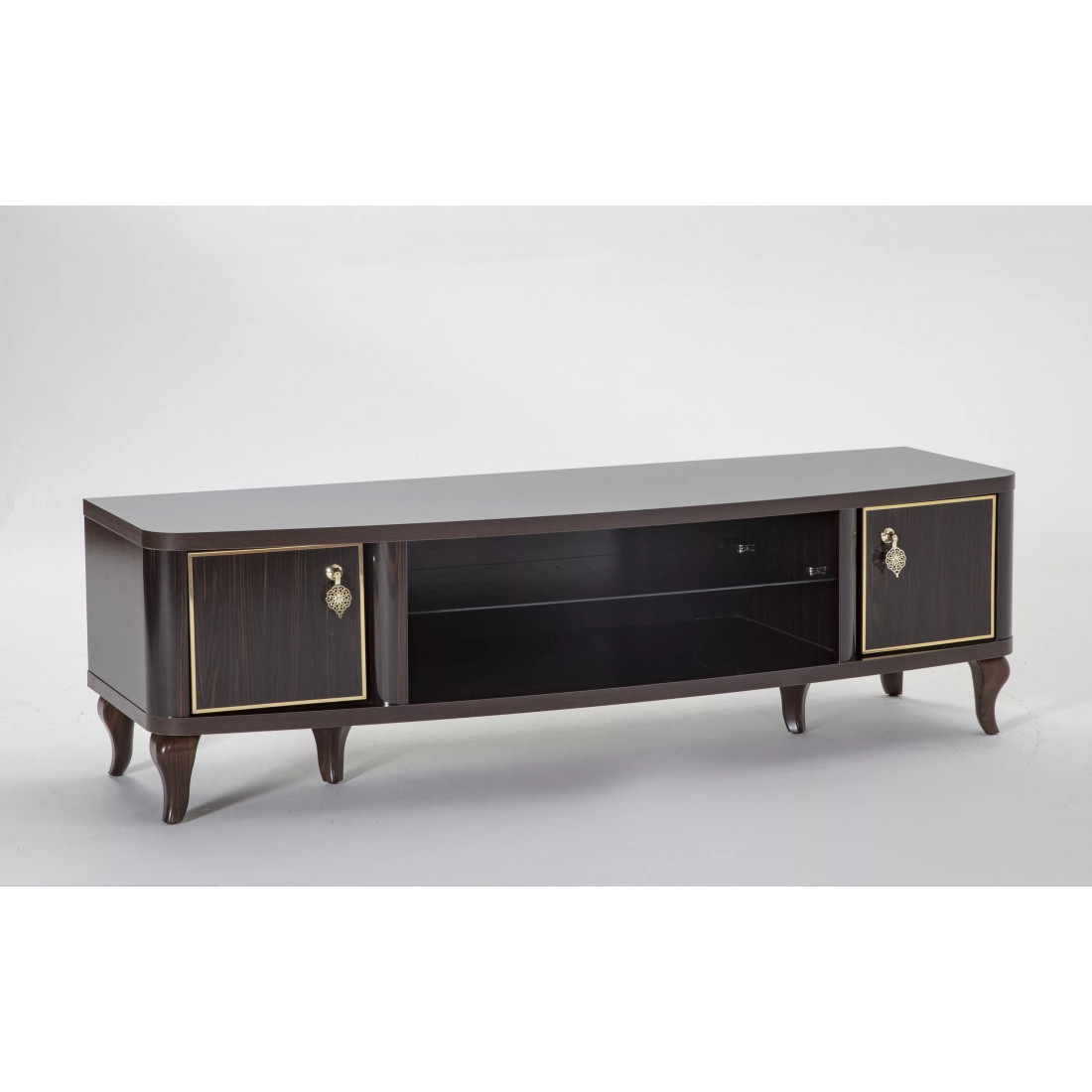 Тумба под ТВ "Легенда" предназначена для размещения большого плазменного телевизора. Ее дизайн заслуживает Вашего внимания, изделие представлено в классическом белом стиле с золотистыми полосами на дверцах и белыми изогнутыми сужающимися к полу ножками. По центру тумбы находится углубление под два отделения, разделенные стеклянной полкой. За счет использования высококачественных материалов, удалось добиться долговечности данного изделия.