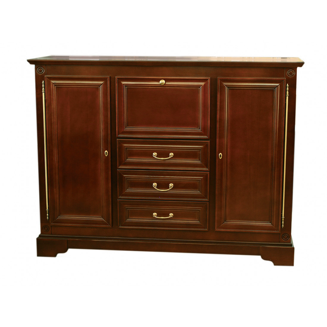 Классическая двухдверная тумба из коллекции корпусной мебели "Полонез" станет отличным дополнением для гостиной или кабинета. Изготовлена из массива и шпона бука в оттенке "Черешня". Выдвижные ящики на направляющих с доводчиком фирмы "Hettich".